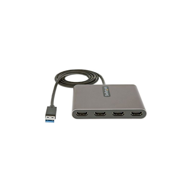Adaptador Externo de Vídeo USB 3.0 | 4x 1080p | para 4 MonitoresEste adaptador USB 3.0 a HDMI® le permite ampliar su escritorio añadiendo cuatro monitores o pantallas HDMI a su ordenador portátil o de sobremesa utilizando un solo puerto USB tipo A.Aumente su productividadEste adaptador de USB-A a 4 HDMI cuenta con cuatro salidas de vídeo, lo que aumenta su productividad al ofrecerle más espacio de pantalla para trabajar. Con las pantallas múltiples tendrá la libertad de acceder a varias aplicaciones al mismo tiempo y de consultar material en una pantalla mientras compone en la otra. Utilice el adaptador multimonitor de USB a HDMI para ampliar o reflejar sus pantallas, o para crear un videowall llamativo.Vídeo y audio de alta definiciónAprovechando la interfaz USB 3.0, este dongle adaptador para cuatro monitores ofrece resoluciones de alta definición de hasta 1920x1080 (1080p) en los cuatro puertos. El adaptador también admite audio de 2 canales a través de HDMI.Fácil configuraciónEl conversor de pantalla USB tipo A a HDMI está equipado con un cable USB-A de 1 m que proporciona una distancia adicional entre el adaptador y su dispositivo anfitrión, lo que garantiza una configuración flexible. También admite una instalación automática del controlador para facilitar su uso.El adaptador de vídeo externo se alimenta por bus, sin necesidad de alimentación externa.Software del Asistente MultimonitorLa aplicación Multi-Monitor Assistant proporciona una interfaz de usuario que asiste a los usuarios en la multitarea y permite cambiar rápidamente de un monitor a otro. Permite funciones adicionales, ayudando a los usuarios a arrastrar y soltar, zoom opcional, escalado dividido y ventanas en cascada a la pantalla principal, así como la creación de un muro de vídeo dinámico o matricial.El USB32HD4 está respaldado por una garantía de 3 años de StarTech.com y un soporte técnico gratuito de por vida.Nota:Los cuatro monitores deben ser del mismo tamaño y resolución para conseguir un videowall.El adaptador sólo es capaz de duplicar hasta dos pantallas adicionales.The StarTech.com Advantage
