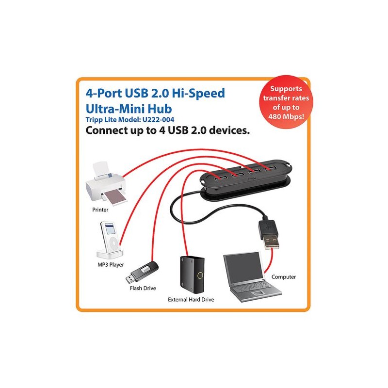 El U222-004 de Tripp Lite es una forma económica para ampliar el número de puertos USB disponibles en la computadora Su diseño compacto con cable integrado es perfecto para viajes, cabiendo fácilmente en una bolsa de laptop. Permite altas tasas de transferencia de datos USB 2.0 hasta 480 Mbps y es compatible con sistemas anteriores USB 1.1. Alimentado por el bus mediante el puerto USB de la computadora...no requiere energía externa, pero incluye un puerto Micro B para una conexión adicional a la computadora en caso de que se necesite más energía.Los cuatro puertos soportan Carga de Baterías (BC) USB especificación v1.2, que proporcionan hasta 1.5A para carga rápida de dispositivos móviles (la carga BC 1.2 requiere fuente de alimentación externa, no incluida)• Hub Compacto USB 2.0 de 4 puertos• Cable Integrado, 15.2 cm [6"]• Puerto Micro-B incluido para energía adicional desde la computadora• Soporta Carga de Baterías v1.2 desde USB con fuente de alimentación externa adicional (no incluida)